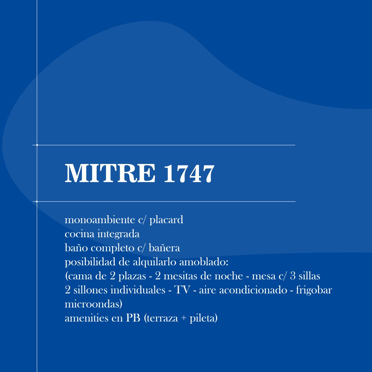 Monoambiente amoblado con amenities - Cocina con microondas y frigobar. Espacio de guardado - Mesa con 3 sillas - 2 sillones individuales (reclinables) - Placard empotrado - Cama de 2 plazas - Televisor colgado - Baño completo con bañera - Amenities > Pileta en PB Condiciones de alquiler: - Contrato por 2 años 🗓 - Actualización cada 4 meses según ICL 📈 - TGI, API, Expensas ordinarias y servicios a cargo del inquilino 100% 🧾 - Alquiler mensual $350.000 (Transferencia) - Gastos administrativos mensuales: $10.500 🧮 (Transferencia) Gastos de ingreso: - Honorarios (5%) $420.000 💼 (Efectivo o Transferencia) - Sellado (0,60%+fojas) $55.000 📝 (Efectivo) - Informes (3 garantes + 1 inquilino) $60.000 🔎 (Efectivo o Transferencia) Total para ingresar: $895.500 ✅ Reserva Para realizar la reserva del inmueble, se requiere únicamente presentar la documentación necesaria. Se ofrece la posibilidad de enviarla vía WhatsApp mediante fotografías correctamente recortadas y legibles, en formato PDF o fotocopias legibles + el costo de las averiguaciones. Garantías - OP1 | 3 garantías laborales (opción más rápida) - OP2 | 2 garantías propietarias* - OP3 | 2 garantías laborales + 1 garantía propietaria* *tener en cuenta que las averiguaciones de garantías propietarias demoran Detalles de garantías - Garantías laborales: 3 últimos recibos de sueldo con antigüedad no menos de 1 año + DNI (frente y dorso), apellido materno, celular y mail. - Garantías propietarias: Escritura completa, API, DNI (adelante y atrás), apellido materno, celular